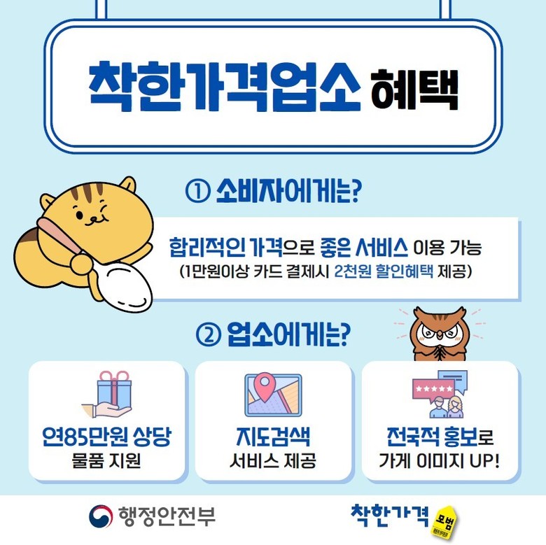 착한가격업소로 지정되면 착한가격 인증 표찰과 업소 특성에 맞춘 운영 물품, 공공요금 등이 지원된다. 또한, 착한가격업소는 착한가격업소 누리집(https://www.goodprice.go.kr), 네이버 지도, 카카오맵, 티맵 등을 통해 쉽게 확인할 수 있다.