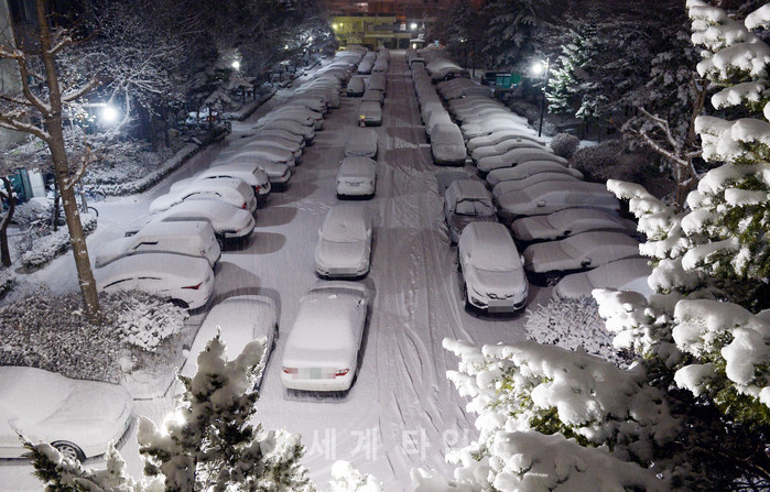 큰 추위라는 뜻의 절기상 대한이자 많은 눈이 내린 20일 오전 서울 강동구 둔촌동의 한 아파트에 주차장에 많은 눈이 내려 차량 위에 쌓여 있다. 2017.01.20.