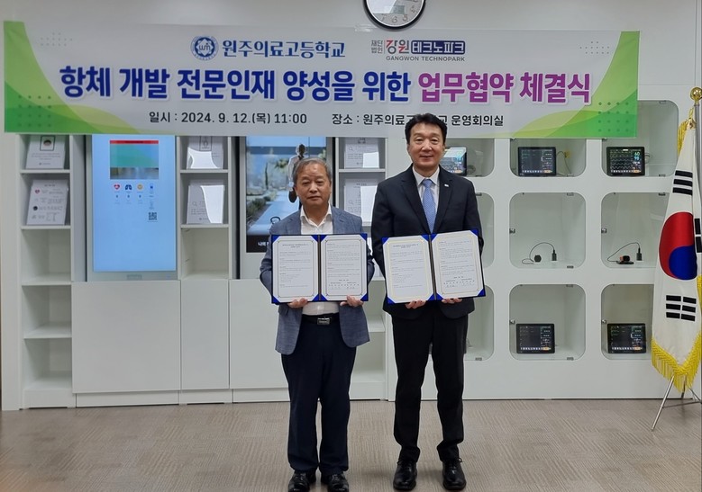 [원주시 세계타임즈=김민석 기자] 원주의료고등학교(교장 송상훈)은 12일(목) 원주의료고 운영회의실에서 (재)강원테크노파크와 항체 개발 전문 인재 양성 및 취업 연계를 위한 업무협약을 맺었다.