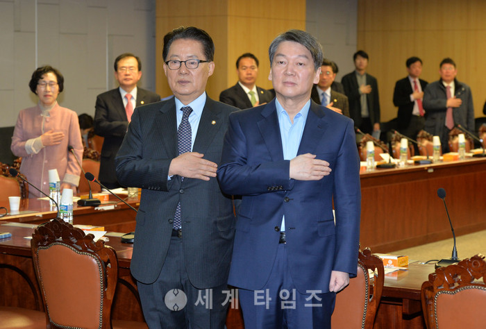 20일 오전 서울 여의도 국회 의원회관에서 열린 국민의당 2017년 국민의당 제2차 정책강화 워크숍에 참석한 박지원(왼쪽) 대표와 안철수 전 대표가 국민의례를 하고 있다. 2017.01.20.