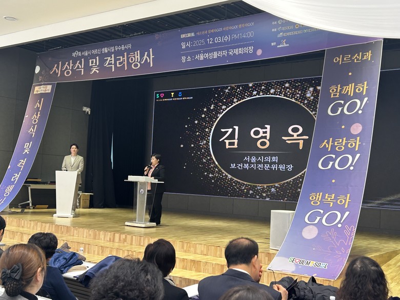 [서울 세계타임즈=이장성 기자] 서울특별시의회 보건복지위원회 김영옥 위원장(국민의힘, 광진3)은 12월 3일(수) 서울의 어르신 돌봄과 영유아 보육 현장을 이끄는 종사자들을 격려하기 위해 연이어 열린 주요 행사에 참석하였다. 김 위원장은 14시 서울여성플라자 국제회의장에서 개최된 「2025 서울시 어르신 생활시설 우수종사자 시상식」에서 종사자의 현장에서 헌신해 오신 노고를 진심으로 치하했다.