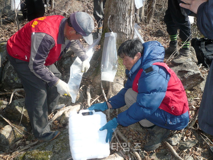 경남 하동군은 지난 주말부터 화개면 일원에서 고로쇠 수액 채취가 시작됐다고 8일 밝혔다. 사진은 화개면 주민들이 고로쇠 수액을 채취하고 있는 모습. 2017.02.08. (사진=하동군 제공)