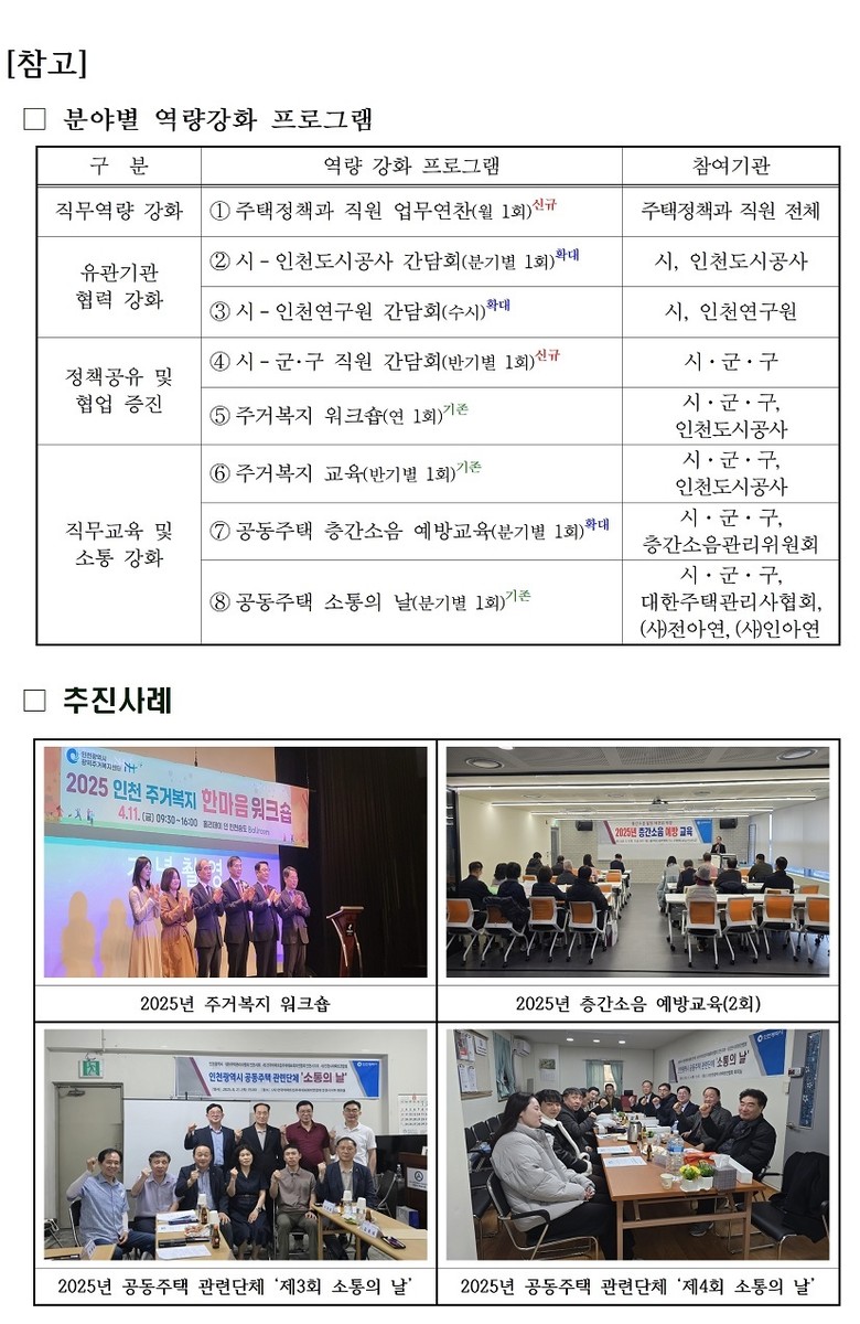 시민 생활과 직결된 공동주택 관리와 주거복지 분야의 전문성도 강화한다. 층간소음 갈등 예방을 위해 층간소음관리위원회 대상 교육을 분기별 1회로 확대하고, 대한주택관리사협회와 아파트 연합회 등이 참여하는 ‘공동주택 소통의 날’을 분기별로 운영해 민관 협치를 통한 공동체 활성화에 나선다. 아울러 주거복지 워크숍과 교육을 정기적으로 실시해 담당자들의 실무 역량을 지속적으로 강화해 나갈 예정이다.