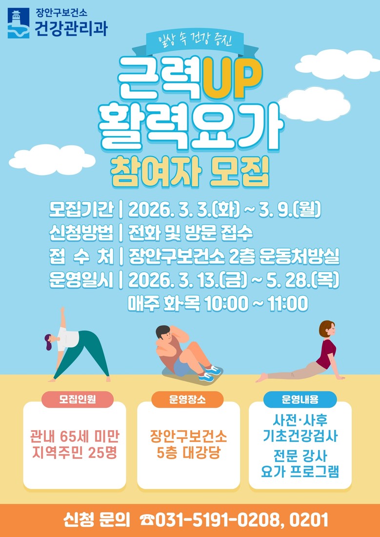 프로그램은 3월 13일부터 5월 28일까지 장안구보건소 5층 대강당에서 진행된다. 주요 내용은 ▲프로그램 전·후 혈압·혈당 등 기초건강검사 ▲주 2회 전문 강사 요가 프로그램 ▲건강행태 설문·만족도 조사 등이다.