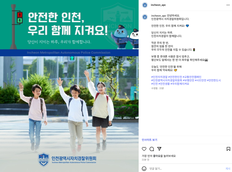 이번 캠페인은 인천시민이 직접 참여하여 “내가 생각하는 안전한 인천의 모습”을 댓글로 남기는 방식으로, 시민이 체감하는 ‘안전의 가치’를 공유함으로써 자치경찰 활동에 대한 공감과 참여를 높이기 위한 사회관계망서비스(SNS) 소통 프로젝트다.
