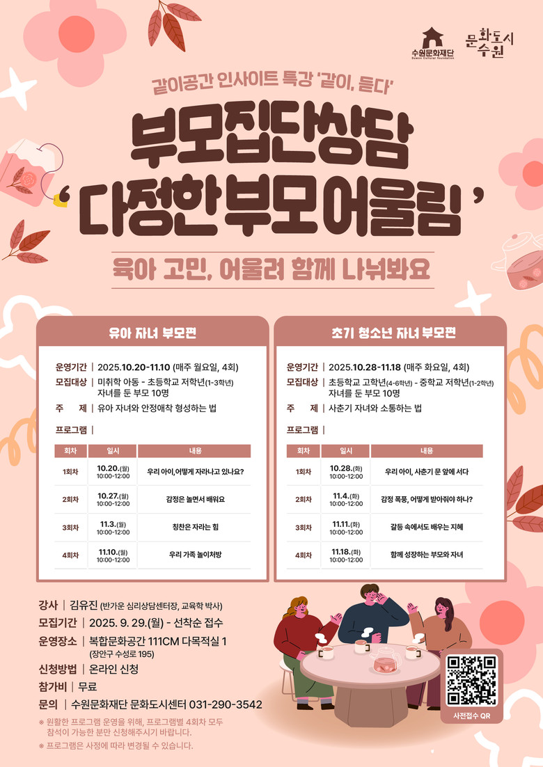 수원문화재단 관계자는 “이번 프로그램이 문화도시 수원의 비전인 ‘서로를 살피고 문제에 맞서는 도시’를 실현하는 의미 있는 실천의 장이 되기를 바란다.”며, “특강으로는 우리 사회의 지향점을 고민해 보고, 부모집단상담으로는 양육의 어려움을 나누며 실질적 해법을 얻는 기회가 되기를 기대한다.”고 말했다.