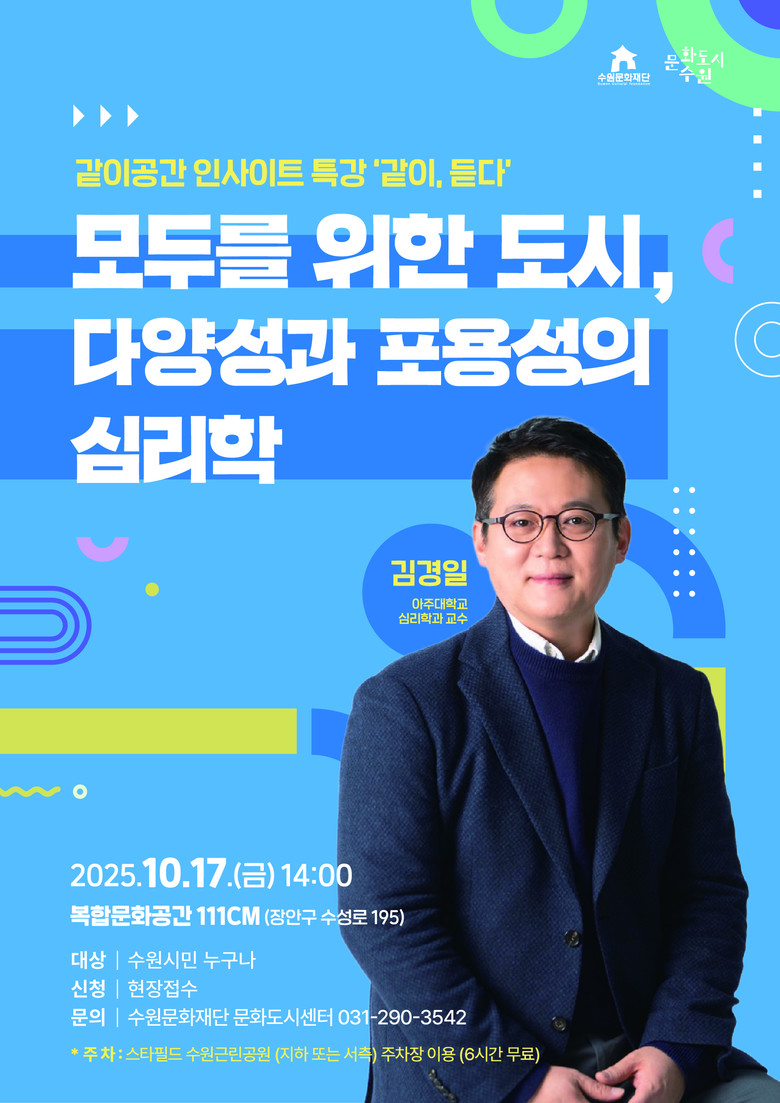 먼저 10월 17일 금요일 오후 2시, 김경일 교수(아주대학교 심리학과)가 ‘모두를 위한 도시, 다양성과 포용성의 심리학’ 강연을 진행한다. 이번 특강에서는 ‘다양성과 포용성’을 주제로 급변하는 사회에서 우리가 갖춰야 할 역량과 자세를 인지심리학적 관점으로 바라본다. 세대를 막론하고 우리 사회가 나아가야 할 방향에 대해 함께 고민하고 공감하는 시간이 될 예정이다.