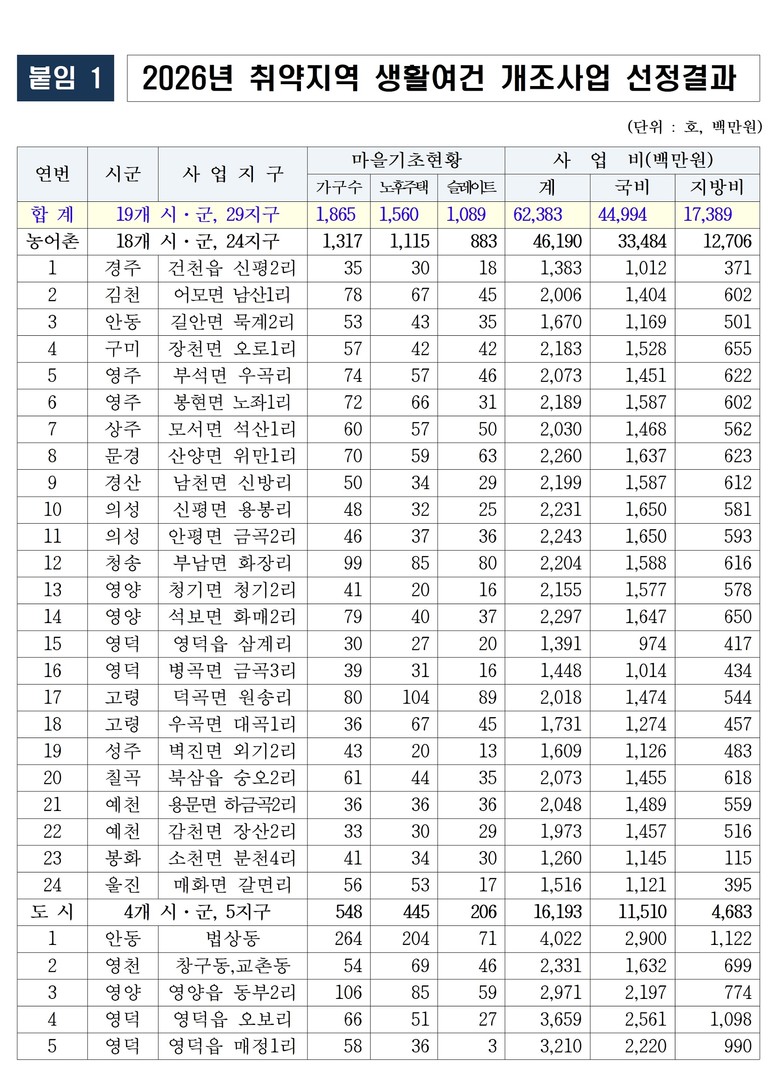 - 산불피해 5개 마을(의성 1, 영양1, 영덕 3) 포함 마을정비 - [경북 세계타임즈=한윤석 기자] 경북도는 대통령 직속 지방시대위원회가 주관하는 2026년 취약지역 생활 여건 개조 사업(새뜰마을사업) 공모에 19개 시군 29개소(도시 5, 농어촌 24)가 최종 확정되어 지난해에 이어 올해도 가장 많은 지역이 선정됐다.