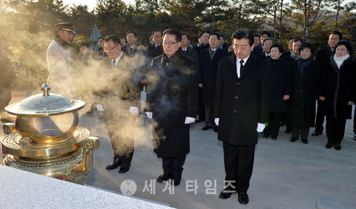 16일 오전 서울 동작구 국립서울현충원에서 국민의당 박지원 대표가 지도부와 함께 故 김영삼 전 대통령 묘역을 참배하고 있다. 2017.01.16.