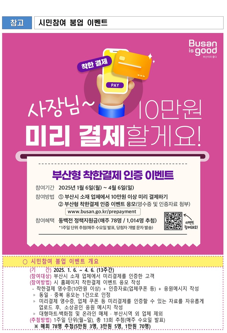 참여를 원하는 시민은 오는 4월 6일까지 부산시 소재 업체에서 10만 원 이상 미리 결제 후 시 누리집(www.busan.go.kr/prepayment)에 결제 영수증과 업체 쿠폰 등 인증 자료를 등록하고 소상공인을 응원하는 메시지를 남기면 된다.
