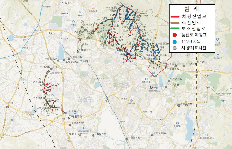 8월까지 고성능 GNSS(위성항법시스템) 측량 장비를 활용해 광교산·칠보산의 시 경계표시판, 등산로 이정표, 112표지목의 위치를 정밀 측량하고, 디지털화해 정밀한 좌표를 확보했다. GNSS 측량은 인공위성을 이용해 지상의 위치를 고정밀 측정하는 공간 정보 수집 방식으로 1㎝ 내 정확도로 측량할 수 있다.