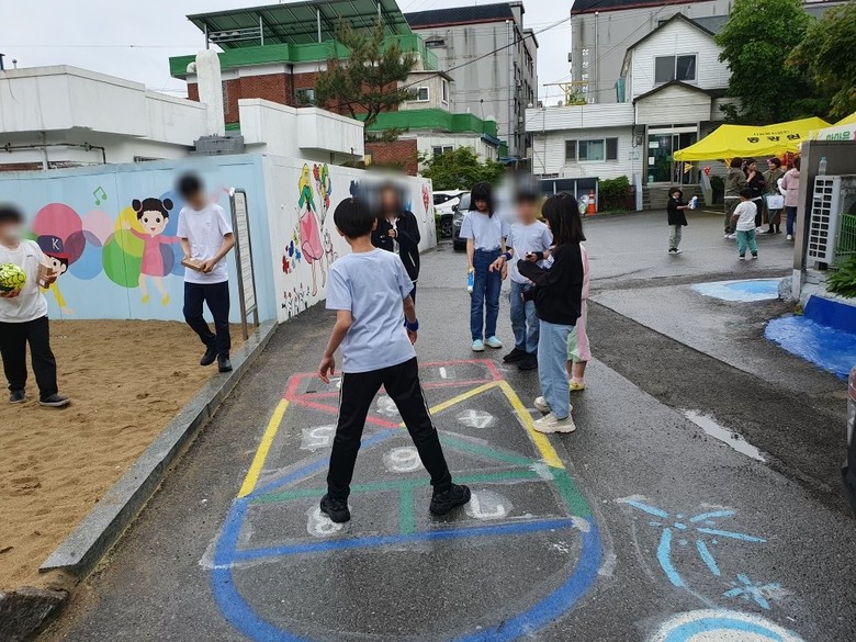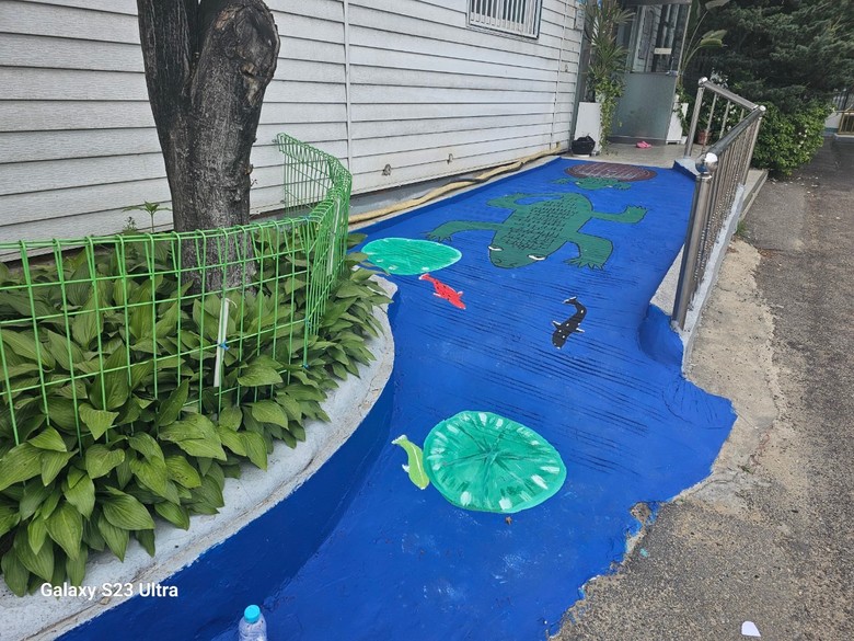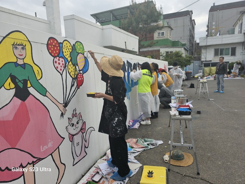 학생들과 교사 20여명이 28일 수원시 팔달구 종합사회복지관 동광원을 방문해서 심심한 골목에 벽화를 그려 밝고 희망적인 분위기를 조성했다. 십대 학생들의 장난기와 재치가 드러난 다양한 캐릭터와 문자디자인이 기존의 벽화와는 다른 에너지를 전달한다. 바닦에 그려 놓은 물방울과 사방치기 놀이보드도 참신하다.