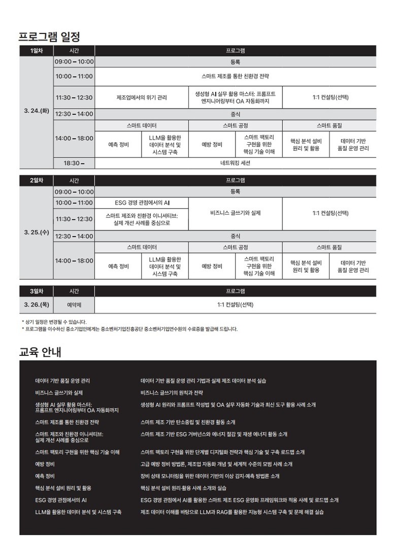 SME Week는 중소 제조기업의 경쟁력 강화를 목표로 기획된 행사로, 스마트 데이터·공정·품질 분야 엔지니어들의 실무 중심 강연과 함께 ‘스마트 제조 친환경 전략’, ‘ESG 경영 관점에서의 AI’ 등을 주제로 한 외부 전문가 특강이 진행된다.