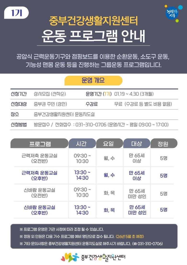 현재 1기 신청은 마감됐으며, 이후 프로그램 참여를 원하는 시민은 중부건강생활지원센터 운동지도실(031-310-0706)로 전화하거나 방문해 신청할 수 있다.