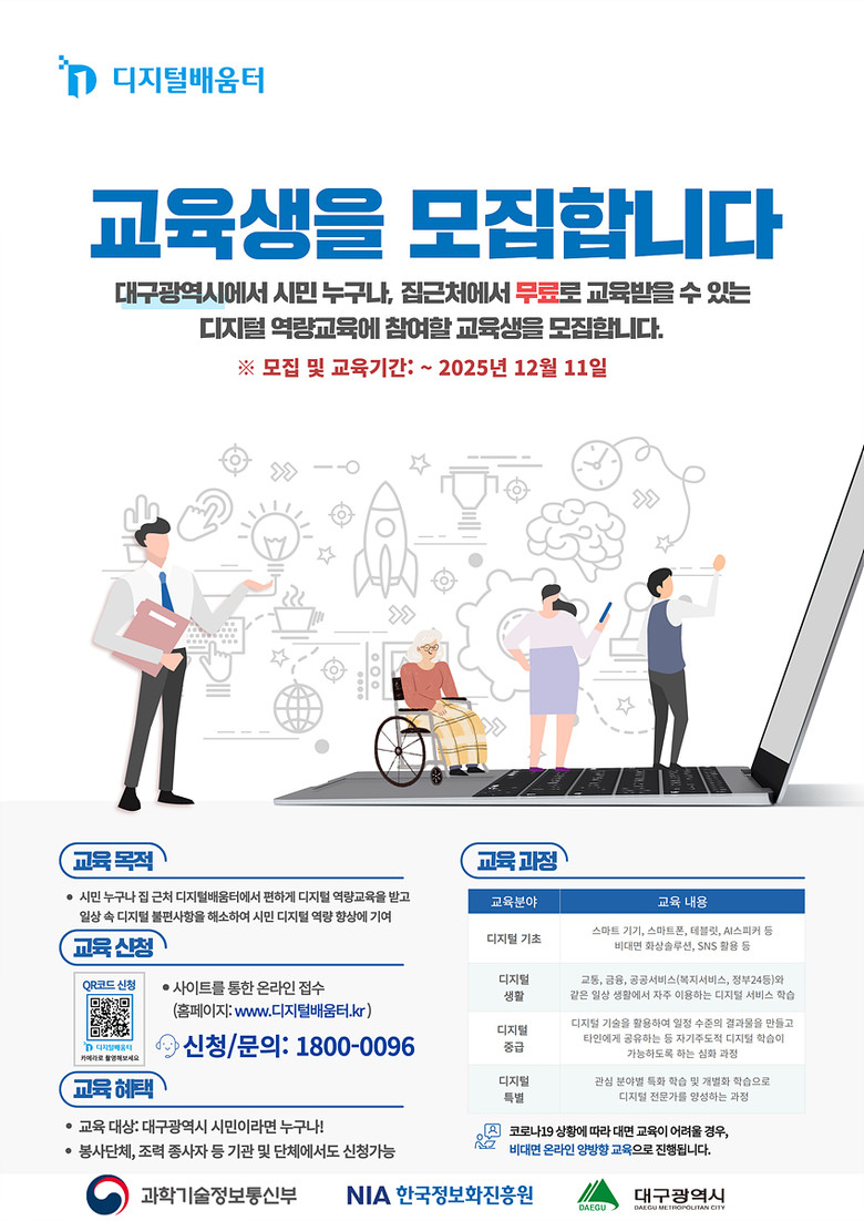 교육 신청은 대표 누리집(www.디지털배움터.kr) 또는 콜센터(☎ 1800-0096)를 통해 연중 수시 신청할 수 있으며, 모든 교육 과정은 무료로 제공된다.
