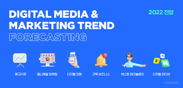 [세계타임즈 이영진 기자]KT그룹의 디지털 미디어렙 나스미디어가 ‘2022년 디지털 미디어&마케팅 트렌드 전망 보고서’를 30일 발행했다. 이번 보고서는 디지털 확장이라는 주제 아래 마케팅, 업종, 서비스, 기술 등 다양한 분야에 걸쳐 2022년 트렌드를 전망했다.