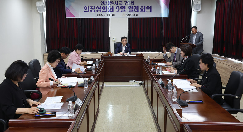 [남동구 세계타임즈=심하린 기자] 인천시 군·구의회 의장협의회가 지난 23일 남동구의회(의장 이정순)에서 9월 월례회의를 개최했다. 이번 회의는 인천시 내 각 군·구 의회 간의 협력과 소통을 강화하고, 지역현안을 논의하는 자리로 마련됐다.