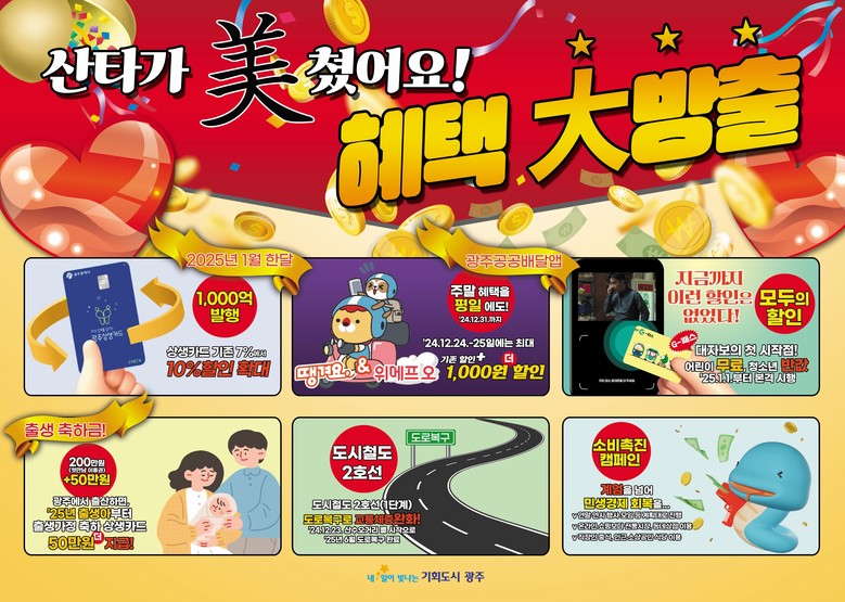 ‘산타가 美(미)쳤어요! 혜택 大(대)방출!’이라는 홍보전단지도 눈길을 끌었다. 전단지에는 상생카드 할인율 확대 등 경제정책은 물론 시민 일상에 도움이 될 수 있도록 1월1일부터 전면적으로 시작하는 대중교통 할인정책인 지(G)-패스, 출생축하금 등 광주시 정책을 함께 담았다.