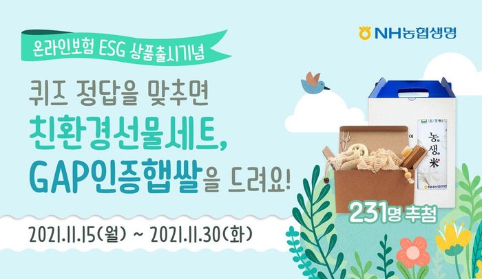 이벤트는 11/15일(월)부터 11/30일(화)까지 진행하며, 농협생명 온라인보험 홈페이지(www.nhelife.co.kr)를 통해 참여 가능하다.