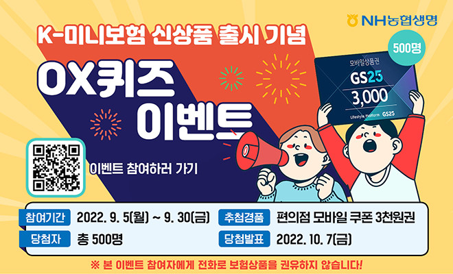 NH농협생명은 이번 신상품 출시를 기념해 2가지 이벤트를 마련했다. 「생활쏘옥NH미니보장보험(Self가입형, 무)」가입자에게는 납입보험료의 10%를 NH포인트로 제공한다. 또한 9월 5일(월)부터 9월 30일(금)까지 농협생명 온라인보험 홈페이지를 통해 간단한 OX퀴즈 이벤트도 진행한다. 퀴즈 정답을 맞춘 분들 중 추첨을 통해 총500명에게 편의점 모바일 쿠폰을 증정할 예정이다.