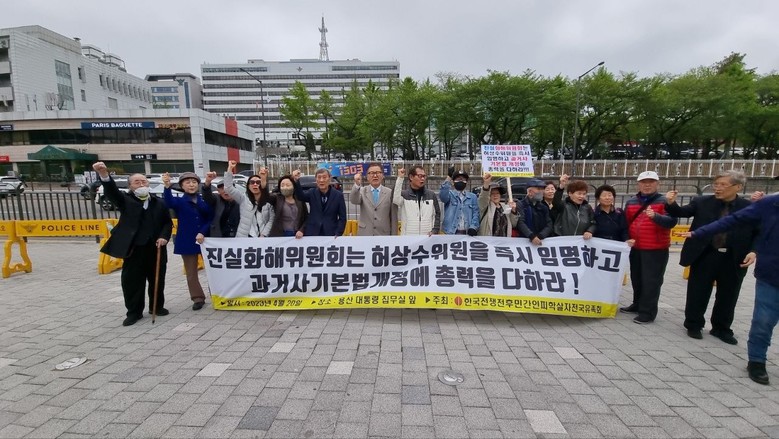 [세계타임즈 백진욱 기자] 한국전쟁전후민간인피학살자 전국유족회(이하 피학살자 전국유족회) 대표단이 지난 4월 20일(목) 정오부터 1시까지 약 1시간 동안 회원 등 약 20여명이 용산 대통령 집무실 건너편 인도 앞에서 윤석열 대통령에게 <진실화해위원회 허상수 위원을 즉시 임명하고 과거사기본법 개정하라!>고 요구하는 기자회견을 개최했다. 즉, “특정인을 임명에서 배제하려고 무리수를 두지 말고 공석 중에 있는 7인 위원 전원을 즉각 임명하고, 국회는 행안위 법안소위에 장기간 상정 계류 중인 관련법 개정안을 즉각 통과시켜라”고 촉구했다.