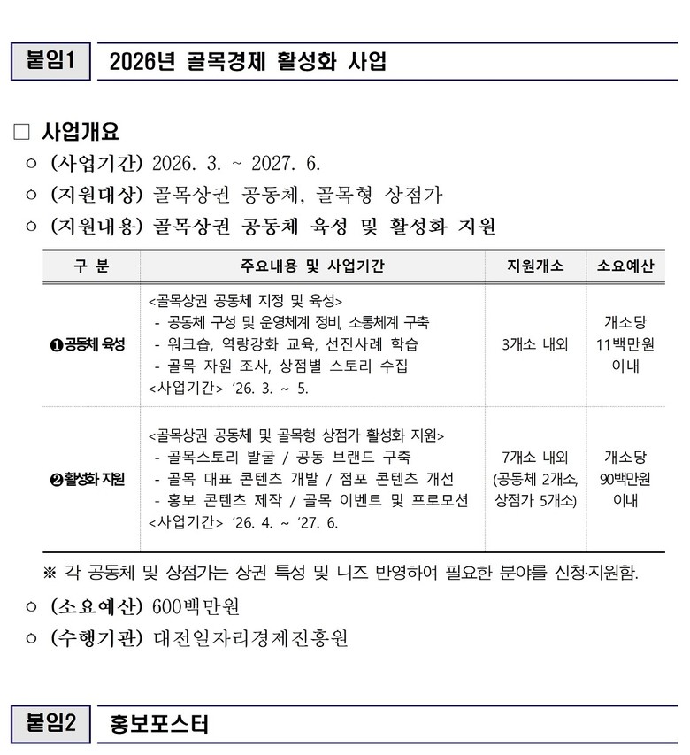 박제화 대전시 경제국장은 “온라인 소비 확산과 경기둔화로 어려움을 겪는 골목상권에 실질적인 활력을 불어넣는 것이 무엇보다 중요하다”라며 “상인들이 함께 성장할 수 있는 기반을 마련하고, 시민들이 머물고 싶은 매력적인 골목 환경을 조성해 나가겠다”라고 말했다.