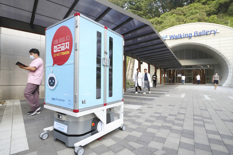 ‘자율주행 이송로봇(AMR, Autonomous Mobile Robot)’은 진료재료, 약품, 린넨(환자 옷, 침대 시트, 이불 등) 등 수술과 진료에 필요한 물품을 자동으로 이송한다. 물품은 분당서울대병원 본관에서 직선으로 약 300m 약 떨어진 헬스케어혁신파크에서 온다. 분당서울대병원은 두 건물을 연결하는 터널인 워킹갤러리에 AMR 6대를 활용한 무인 이송 체계를 구축했다.