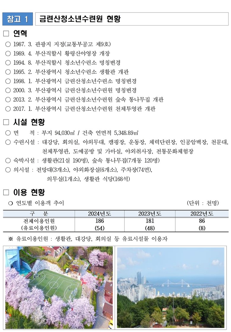 한편, 수련원은 시에서 직영으로 운영하는 청소년 수련시설로 금련산 중턱에 위치하며, 약 9만 제곱미터(㎡) 규모의 넓은 자연환경을 보유하고 있다.