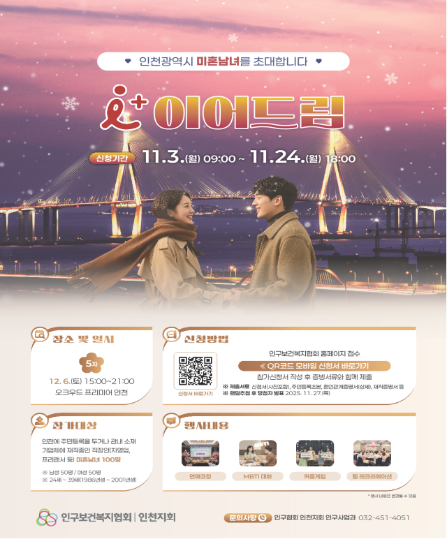 시현정 시 여성가족국장은 “연말을 앞두고 많은 인천 청년들이 참여해 소중한 인연을 맺는 활기찬 만남의 장이 되길 기대한다”라고 말했다.