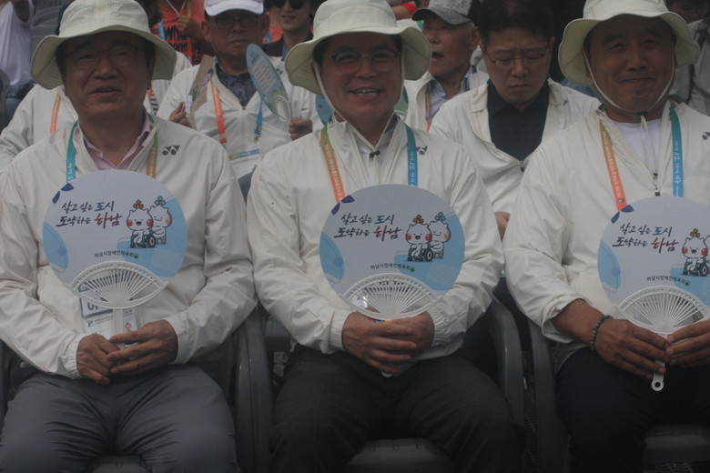 | ▲개회식이 열린 파주스타디움 주경기장에서 이현재 하남시장,금광연 하남시의회 의장 등 환하게 웃고 있다. |