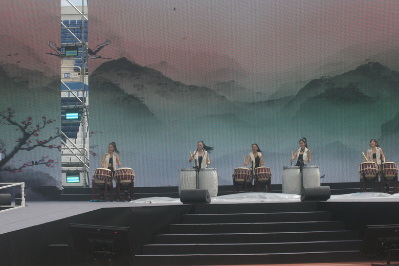 ▲타악그룹 블랙퀸 개회식 식전 공연 모습.