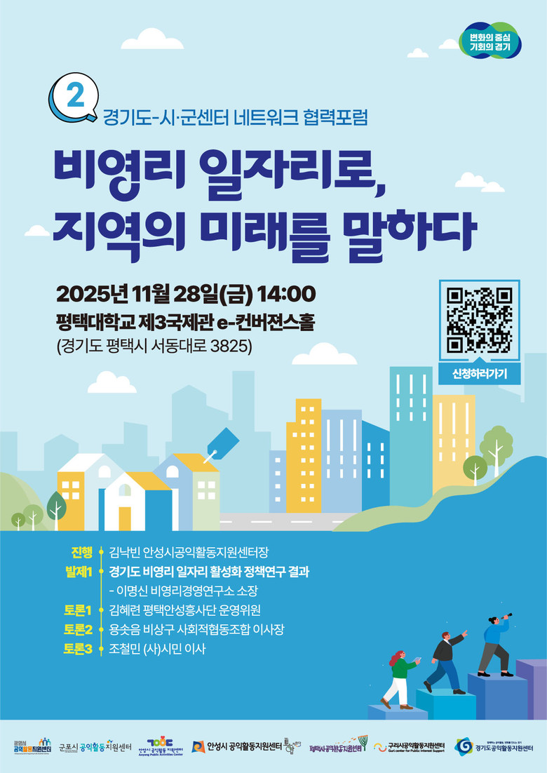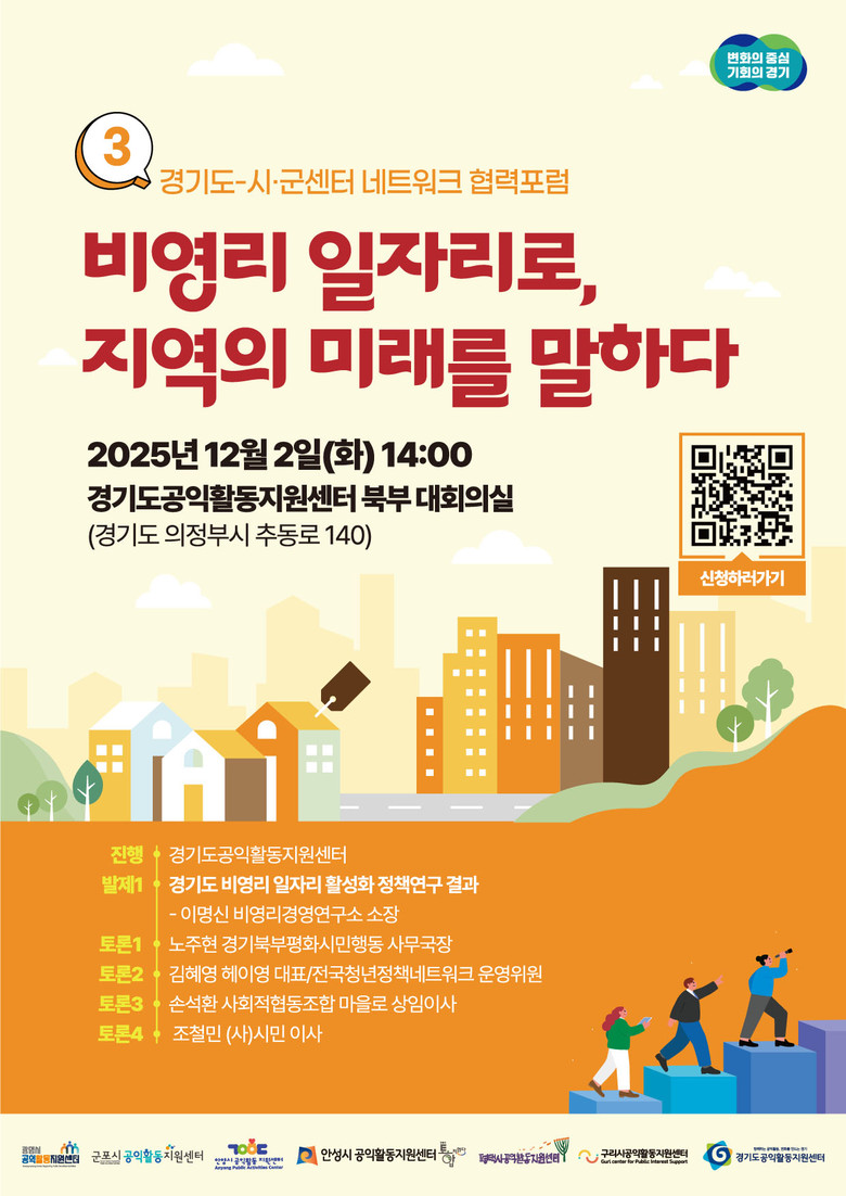 센터는 도내 시군 공익활동지원센터와 협력으로 이번 포럼을 진행하며, 포럼 제목은 ‘비영리 일자리로, 지역의 미래를 말하다’이다.