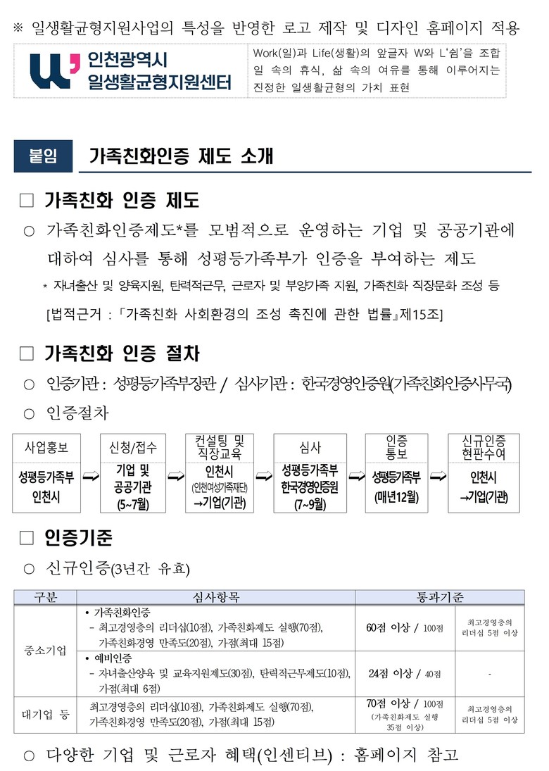 특히 대표적인 사업으로 ‘가족친화인증 지원’은 인천 관내 기업·기관이 일대일 맞춤형 컨설팅을 받고 원활하게 가족친화인증을 받을 수 있도록 무료로 지원하고 있다. 성평등가족부의 가족친화인증을 획득하면, 해당 기업은 출입국 우대카드 발급, 지방세 세무조사 3년유예 등 실질적인 혜택(인센티브)을 받을 수 있으며 신입직원·청년층에게도 긍정적인 조직문화를 제공할 수 있다. 소속 근로자는(가족 포함) 인천 내 나은병원, 인천사랑병원 등에서 건강검진 할인을 받을 수 있다. 작년 말 기준 인천에서는 288곳의 가족친화인증기업이 있다. 자세한 사항은 홈페이지를 통해 확인 할 수 있다.