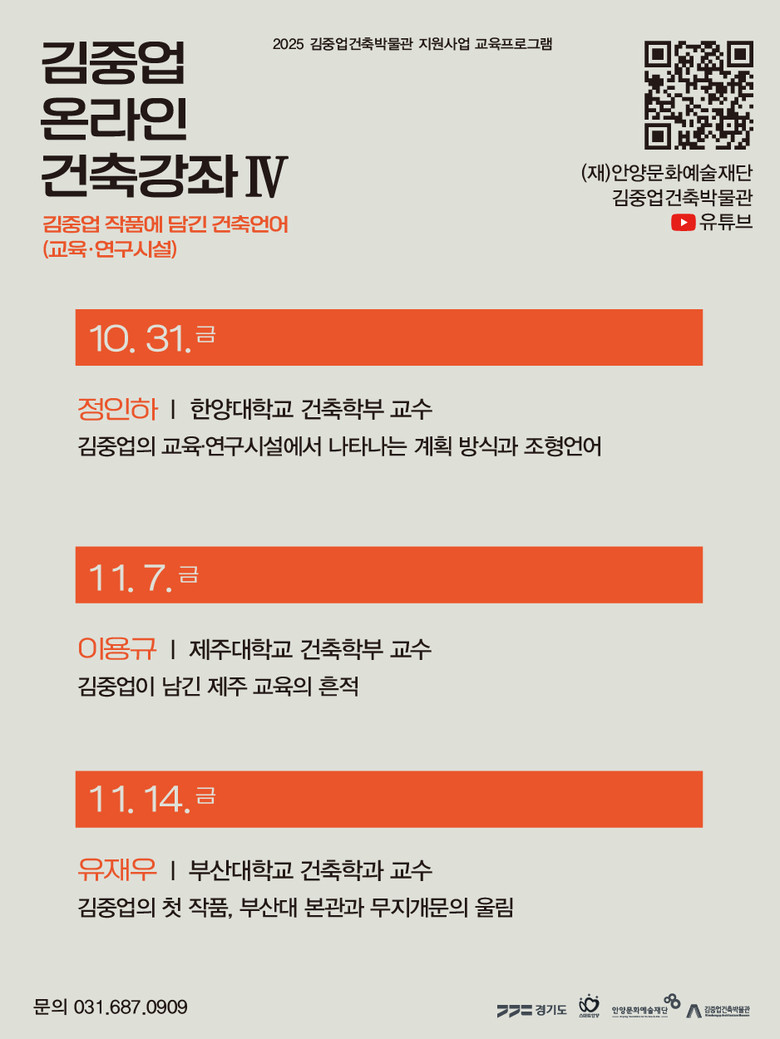 10월 31일부터 11월 14일까지 매주 금요일 총 3편 공개 [안양시 세계타임즈=송민수 기자] (재)안양문화예술재단(이사장 최대호) 김중업건축박물관은 경기도 박물관·미술관 지원사업의 일환으로 10월 31일부터 11월 14일까지 매주 금요일 17시, 총 3편의 온라인 강좌로 구성된 ‘김중업 온라인 건축강좌Ⅳ’를 공개한다. 이번 강좌는 (재)안양문화예술재단과 김중업건축박물관 유튜브 채널을 통해 무료로 시청할 수 있다.