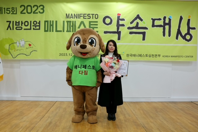 사단법인 한국매니페스토실천본부가 주관하는 ‘매니페스토 약속대상’은 지방의회 역량강화 및 주민 신뢰기반을 구축하기 위해 매년 전국 지방의원을 대상으로 공약이행 분야와 좋은 조례 분야로 나눠 시상한다.
