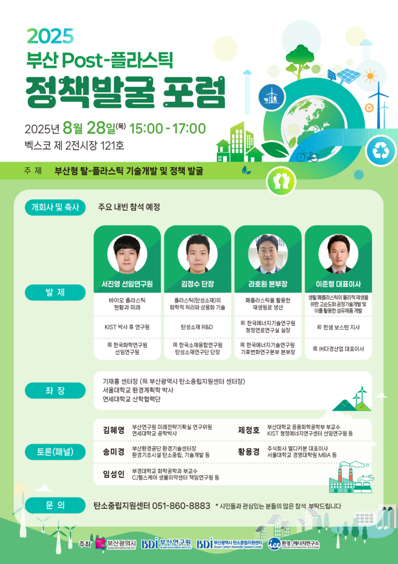 이병석 시 환경물정책실장은 “부산 포스트 플라스틱 정책 포럼 개최를 통해 산학연이 함께 부산의 탈-플라스틱 기술개발 및 정책을 발굴할 수 있도록 부산 시민들의 많은 관심과 참여를 바란다”라고 전했다.
