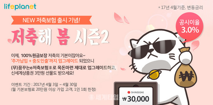 라이프플래닛은 오는 4월 30일까지 (무)꿈꾸는e저축보험Ⅱ에 월 보험료 20만원 이상 가입하는 신규 고객 전원에게 신세계 모바일 상품권 3만원을 증정한다.