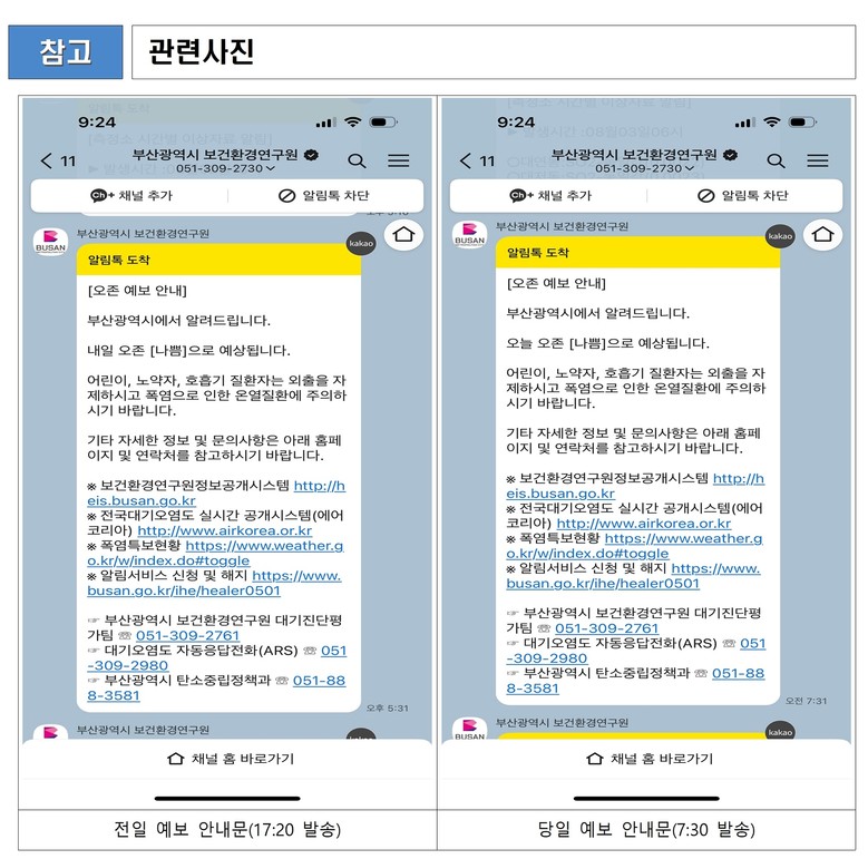 한편, 알림 서비스를 편리하게 받아볼 수 있는 '알림톡 서비스'는 연구원 누리집(busan.go.kr/ihe>열린마당>대기오염예보 알림서비스)이나 전화(☎ 051-309-2759)로 신청할 수 있다.