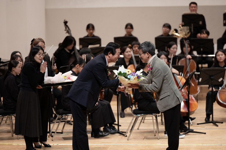 | ▲ 꿈쟁이오케스트라 정기연주회에 참석한 후원자에게 꽃다발을 전달하고 있다. |