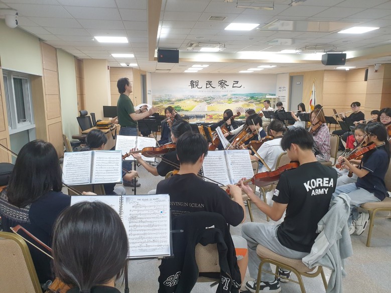 | ▲ 팔달구청 대회의실에서 파트 연습을 하고 있는 꿈쟁이오케스트라 단원들. |