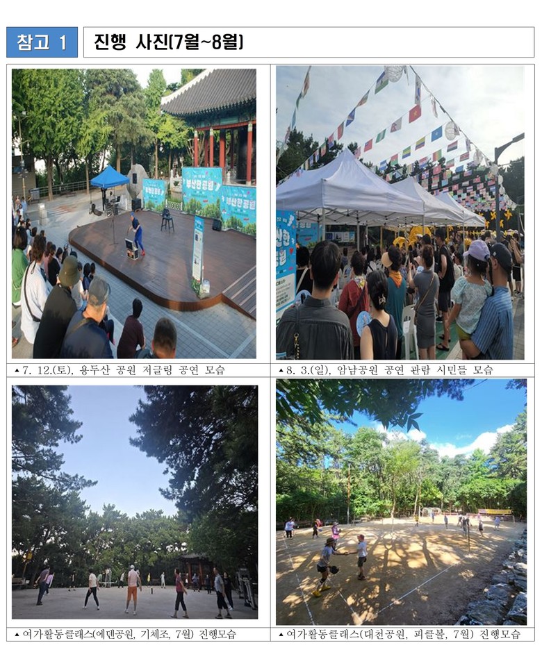 한편, 폭염으로 여가 활동은 8월 한 달 휴강됐으나 ▲중구 용두산공원·서구 암남공원에서는 공연이 ▲부산진구 감고개 공원에서는 수채화·손바느질·손뜨개·토탈공예 등 아카데미 프로그램이 계속 진행됐다.