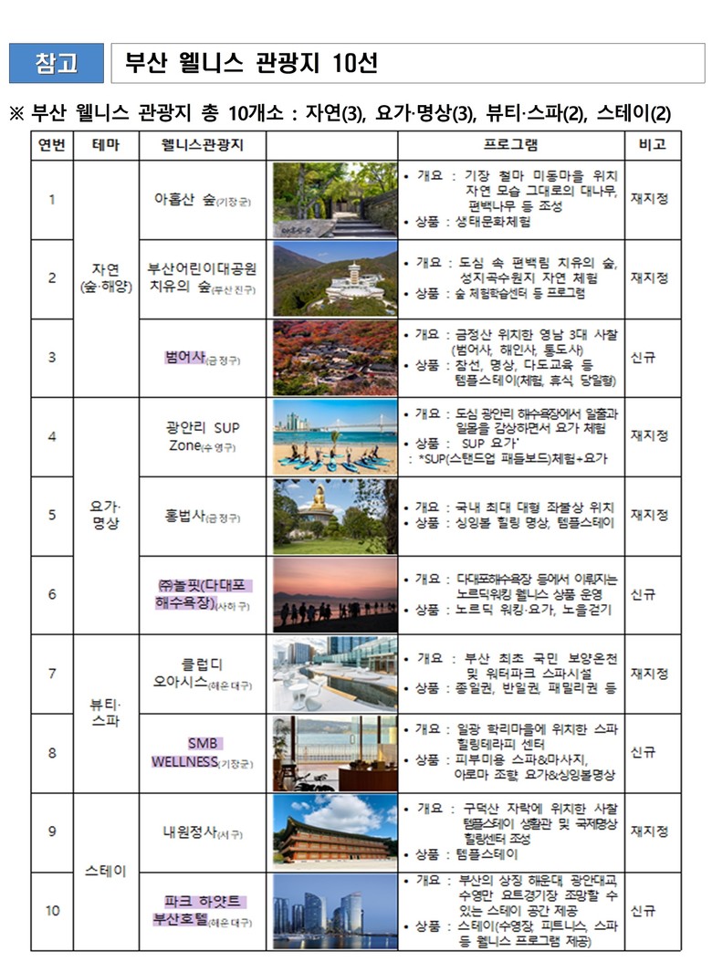 ◈ 올해는 ▲웰니스관광지 추가 선정 및 고도화 ▲웰니스의료관광페스타 개최 [부산 세계타임즈=이용우 기자] 부산시(시장 박형준)는 지난 11일 문화체육관광부 주관 '웰니스·의료관광 융복합 클러스터 2차년도 사업 성과평가' 결과 '의료관광 중심형' 분야에서 1위로 선정돼 국비 5억 원을 확보했다고 밝혔다.