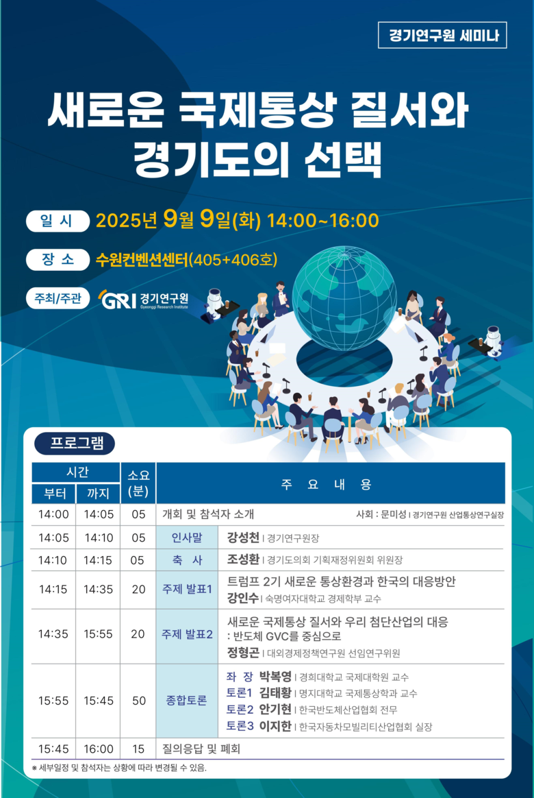 경기연구원 관계자는 “본 세미나가 변화하는 국제통상 질서에 대해 경기도 차원의 전략적 대응 방향을 제시하고 정책 대안을 모색하는 자리가 되기를 바란다”고 말했다.