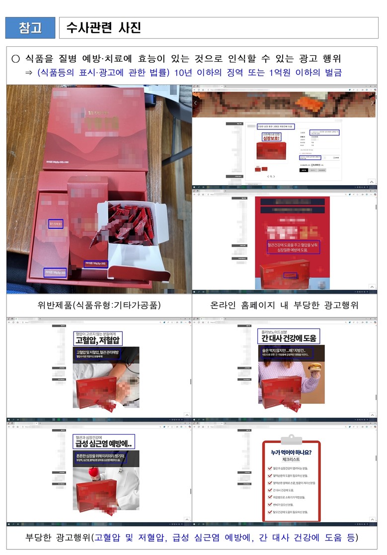 ‘가’ 업소는 자사가 제조·판매하는 기타가공품을 온라인 누리집에 홍보하며 ‘심장, 혈관, 고혈압, 지방간에 도움’ 등 질병 예방·치료 효과가 있는 것으로 오인할 수 있는 문구를 사용했다. 이 광고를 통해 최근 1년간 해당 제품 246박스를 판매해 약 2천400만 원의 매출을 올렸다.