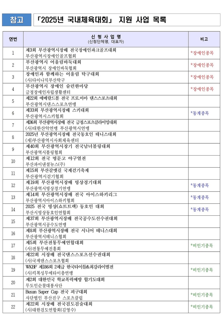▲부산광역시 장애인 슐런*대회 ▲장애인과 함께하는 어울림 탁구대회 등을 추가해 다양한 종목의 생활체육 활성화를 도모한다.