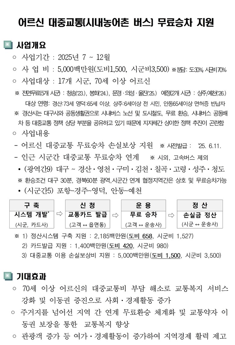[경북 세계타임즈=한윤석 기자] 경상북도는 민선 8기 공약사항인 ‘안전하고 행복하게 살 기회, 어르신 버스 무료 승차 지원(공약95번)’ 을 실천하기 위해 7월 1일부터 도내 22개 시·군 어르신 시내 농어촌버스 전면 무료화한다.
