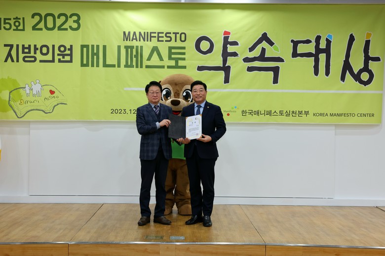 ‘2023 지방의원 매니페스토 약속대상’은 한국매니페스토실천본부가 주최하며 지역발전과 주민들의 복지증진 및 삶의 질 향상을 위해 헌신하고 매니페스토 이행에 충실한 지방의원에게 주는 상으로 ‘공약이행’과 ‘좋은조례’ 2개 분야로 나눠 분야별 전문가 심사를 통해 최종적으로 상을 수여한다.