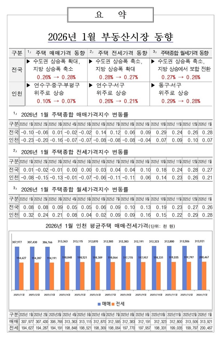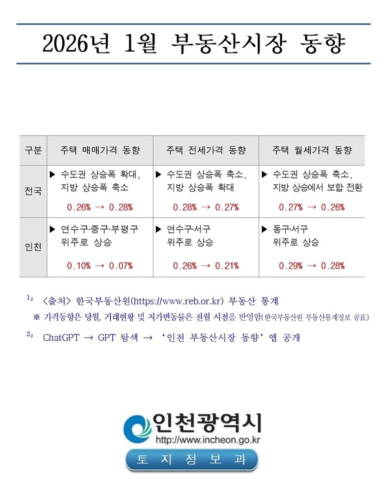 인천시가 한국부동산원의 부동산 통계정보를 분석한 ‘2026년 1월 부동산시장 동향 보고서’에 따르면, 1월 인천의 주택 매매가격지수 변동률은 0.07%로 전월(0.10%) 대비 상승폭은 다소 둔화됐으나 상승 흐름은 유지됐다. 지역별로는 연수구(0.63%), 중구(0.04%), 부평구(0.04%), 남동구(0.03%), 계양구(0.02%), 동구(0.01%), 미추홀구(0.01%) 순으로 상승했으나, 서구(0.04%→-0.15%)는 하락했다.