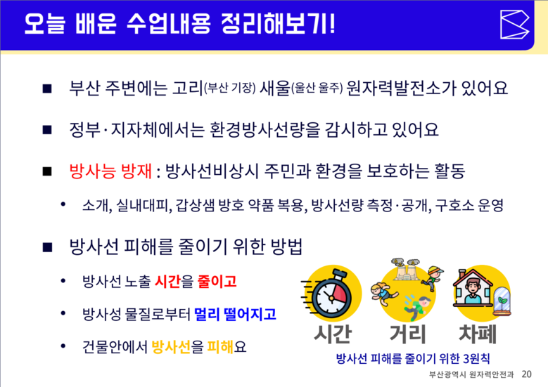 ◈ ▲원자력 에너지 기초지식 ▲방사선·방사능 용어 ▲부산시 주민보호조치 개념 ▲비상 시 행동요령 등 시가 직접 개발한 강의 교안을 통해 체계적인 교육 제공 [부산 세계타임즈=송민수 기자] 부산시(시장 박형준)는 지역 내 원자력 안전 인식 확산과 체계적 교육 제공을 위해 시 교육청과 협업해 '찾아가는 방사능 방재교육'을 본격 추진한다고 밝혔다.