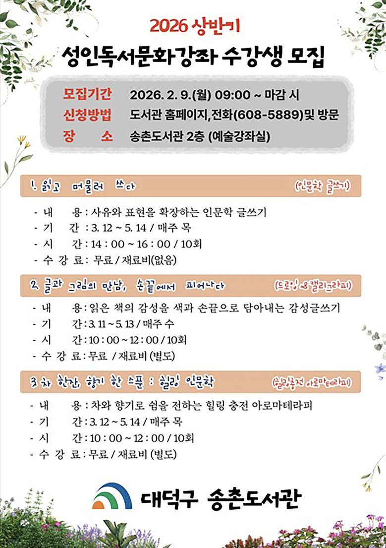 강좌 접수는 9일 오전 9시부터 정원 마감 시까지 진행되며, 신청은 대덕구도서관 홈페이지와 전화(☏608-5889) 또는 방문 접수로 가능하다.